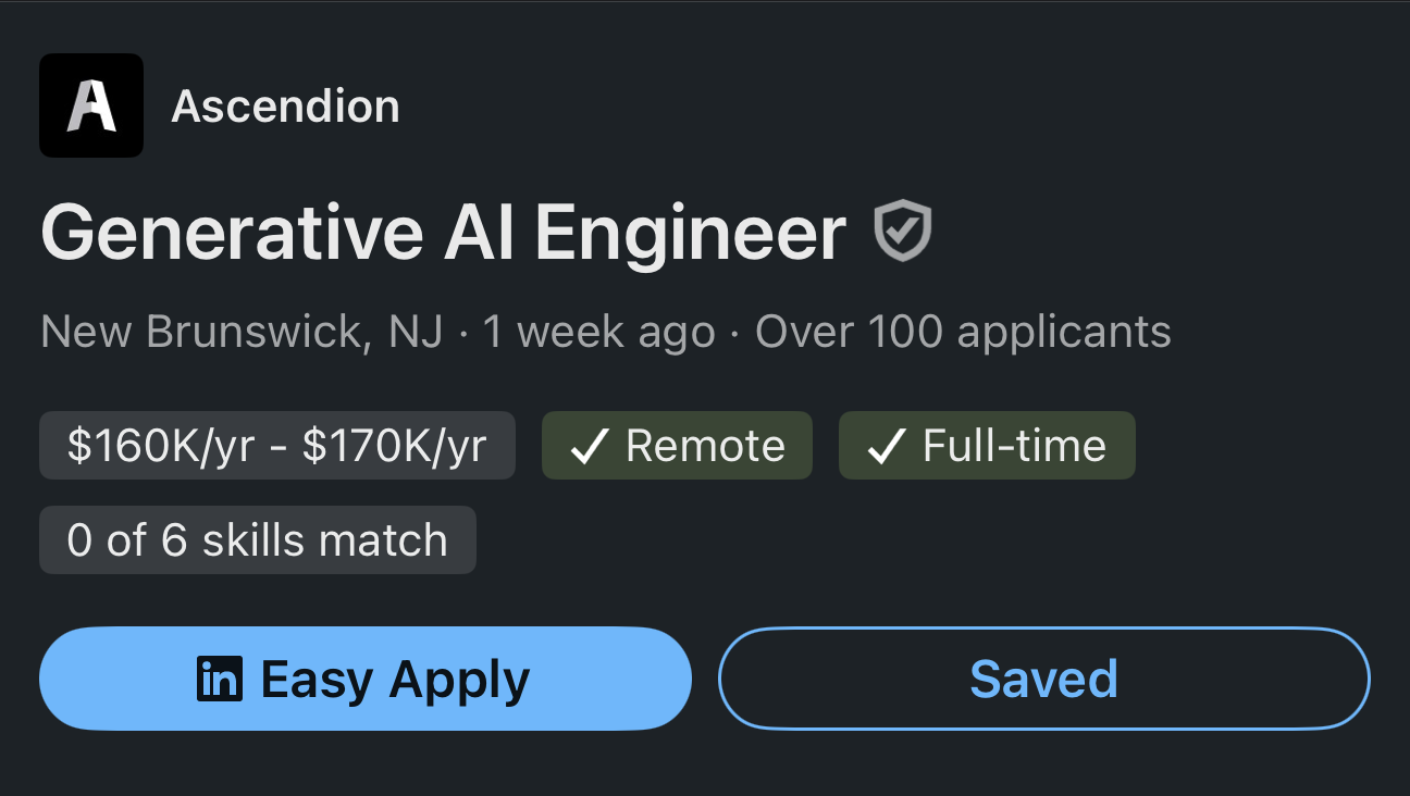 Another company, Ascendion, is hiring for a remote GenAI Engineer at up to $170K/year. You’d be helping them build RAG systems, AI chatbots, and tools that automate workflows across clients.