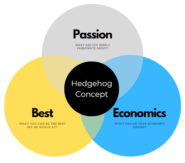 Like many, I struggled with focus, feeling overwhelmed by countless possibilities and uncertain about which path to take. Then, I discovered the Hedgehog Concept, a powerful model introduced by Jim Collins in his book "Good to Great." This concept helped me find clarity by focusing on the intersection of three critical areas: what I am deeply passionate about, what I can be the best at, and what drives my economic engine.